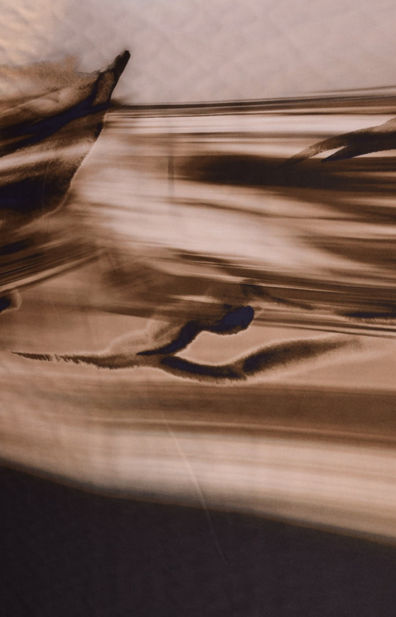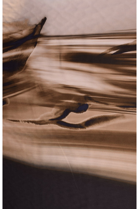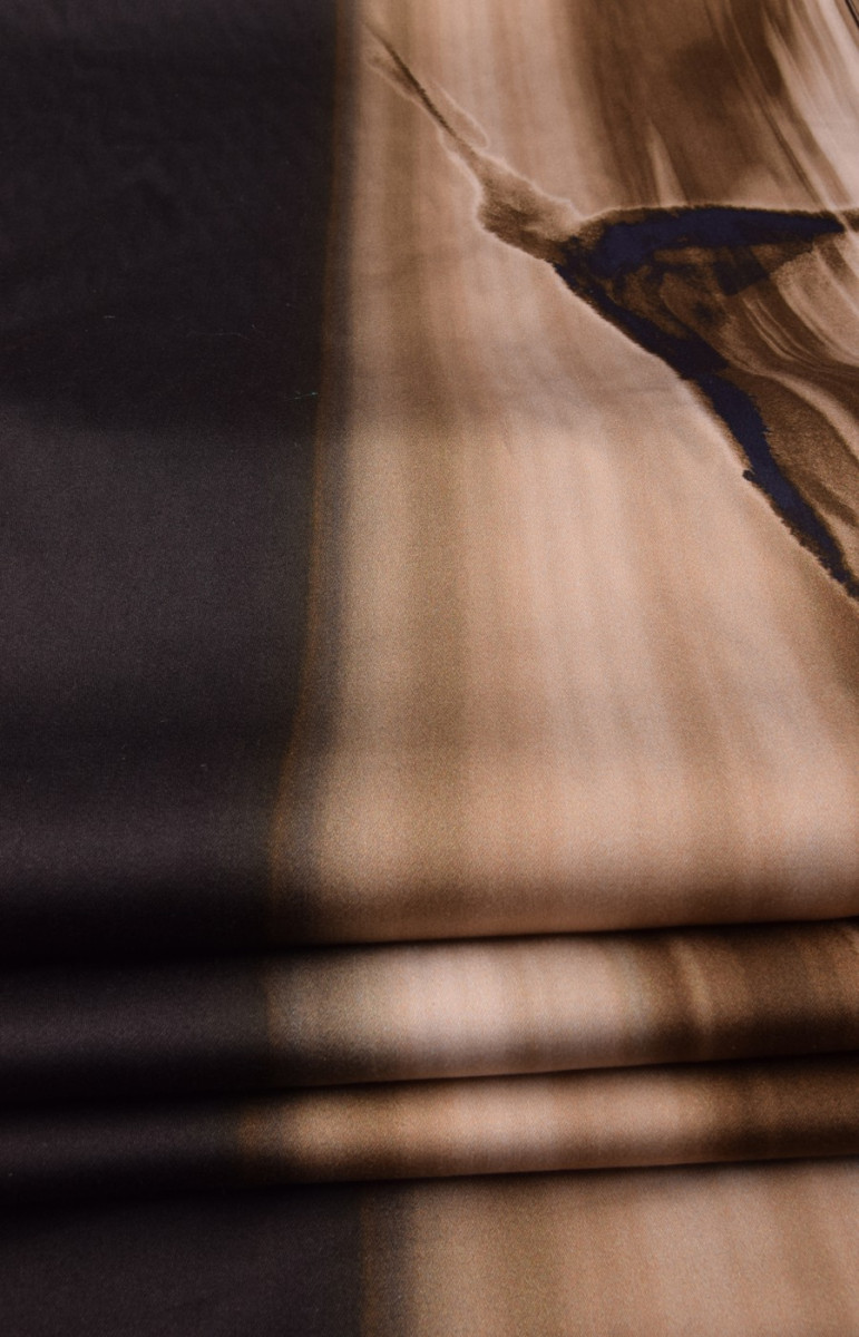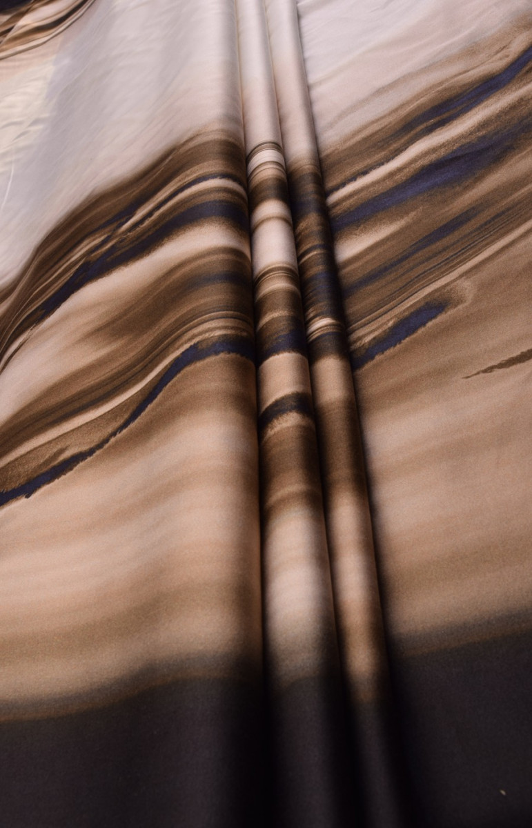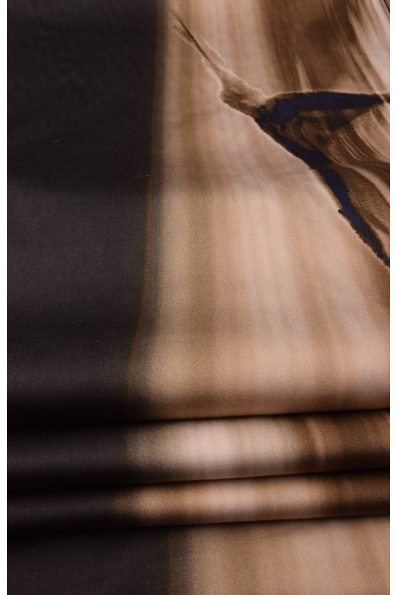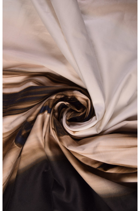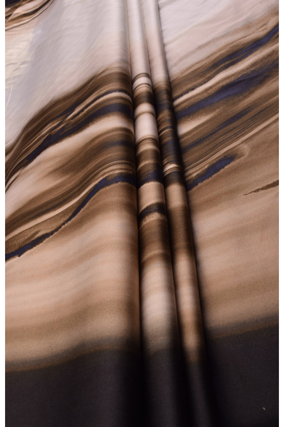 Bumbac mai gros cu elastan cu dungi neregulate în bej și maro închis. Pe fundalul dungilor, siluetele delfinilor sunt neclare.