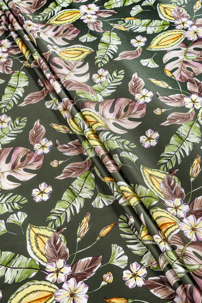 Țesătură italiană de bumbac în kaki cu un motiv de frunze și flori exotice.