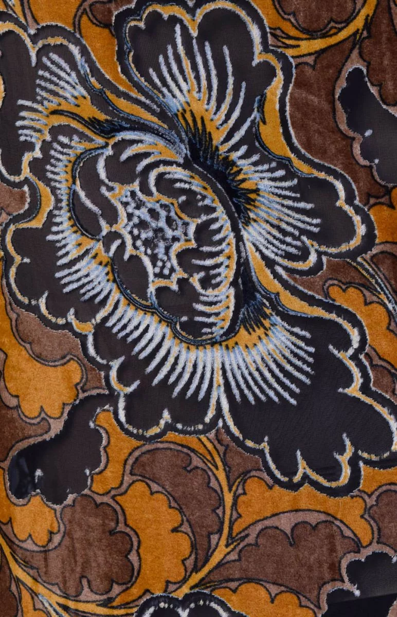 Velur frumos, modelat devore în culori de toamnă. Țesătura este delicată, moale la atingere și se potrivește bine. Perfect pentru rochii, bluze, fuste. Țesută din fire naturale de viscoză și mătase.