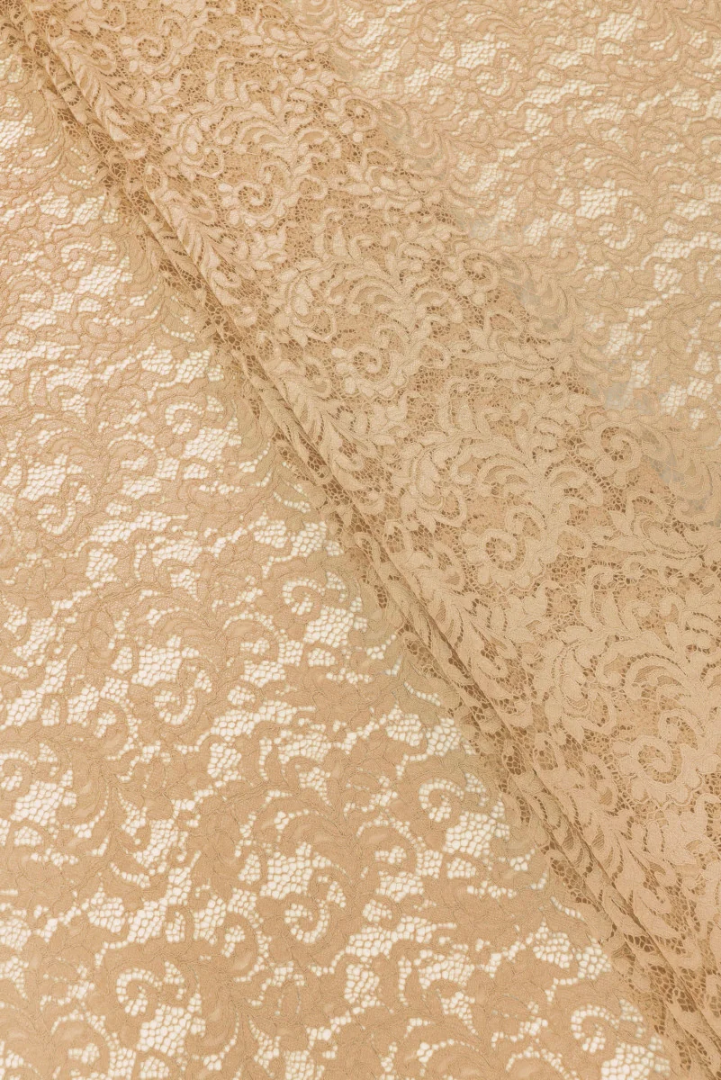Dantelă italiană în nuanțe bej. Materialul are un motiv floral dens, conectat cu plasă și finisat cu un cordon. Coroana de pe ambele părți este finisată cu un dinte decorativ – o coasem circumferențial. Este moale, transparent și inflexibil. O propunere foarte frumoasă într-o culoare neutră, din care poți crea rochii, fuste, bluze sau pantaloni scurți de sărbători.