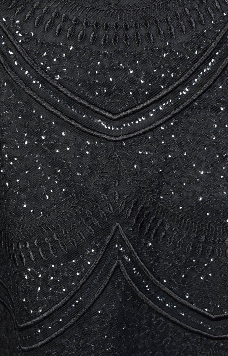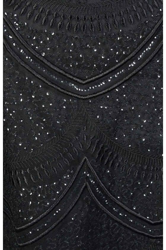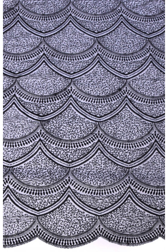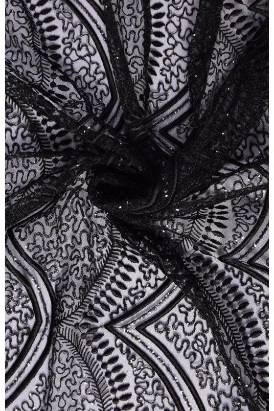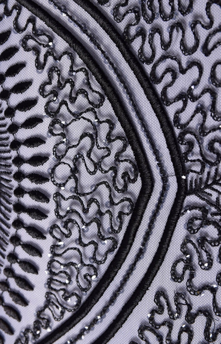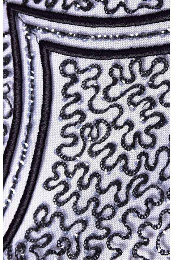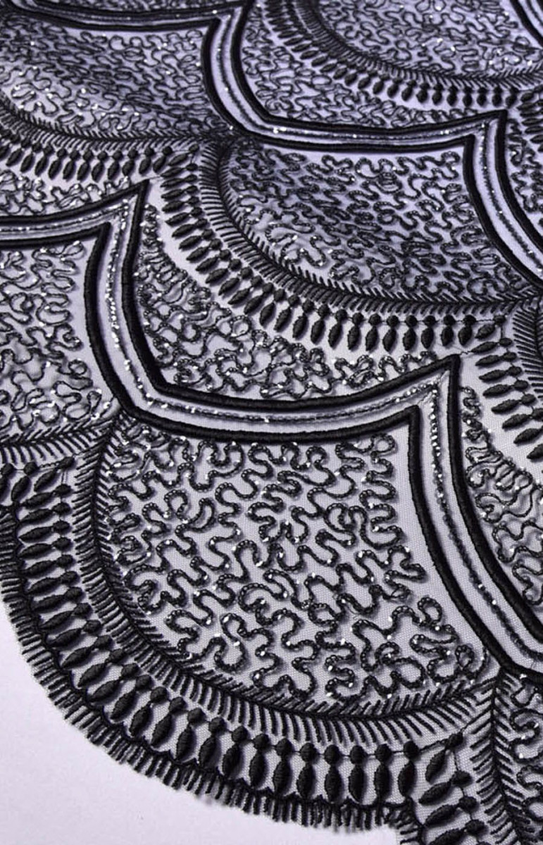 O coroană frumoasă, cu un finisaj dentar pe o parte. Dintele are o lățime de aproximativ 20 cm. Brodat cu margele si paiete. Țesătura este perfectă pentru rochii de seară și bluze.