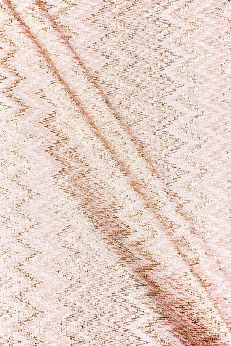 Țesătură jacquard italiană cu motiv în zig-zag auriu roz. Model regulat, dens, frumos decorat cu fir de aur. Țesătura este de grosime medie, ușor rigidă, neelastică și opacă. O propunere eficientă și proaspătă din care poți crea costume, fuste, jachete sau paltoane de primăvară.
