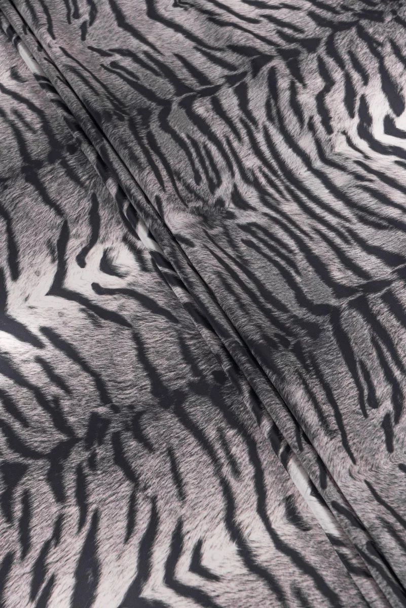 Crep italian de mătase 100% cu un motiv animal în culori gri și negru. Crepul de mătase este o țesătură delicată, subțire, mată, cu o structură ușor aspră.