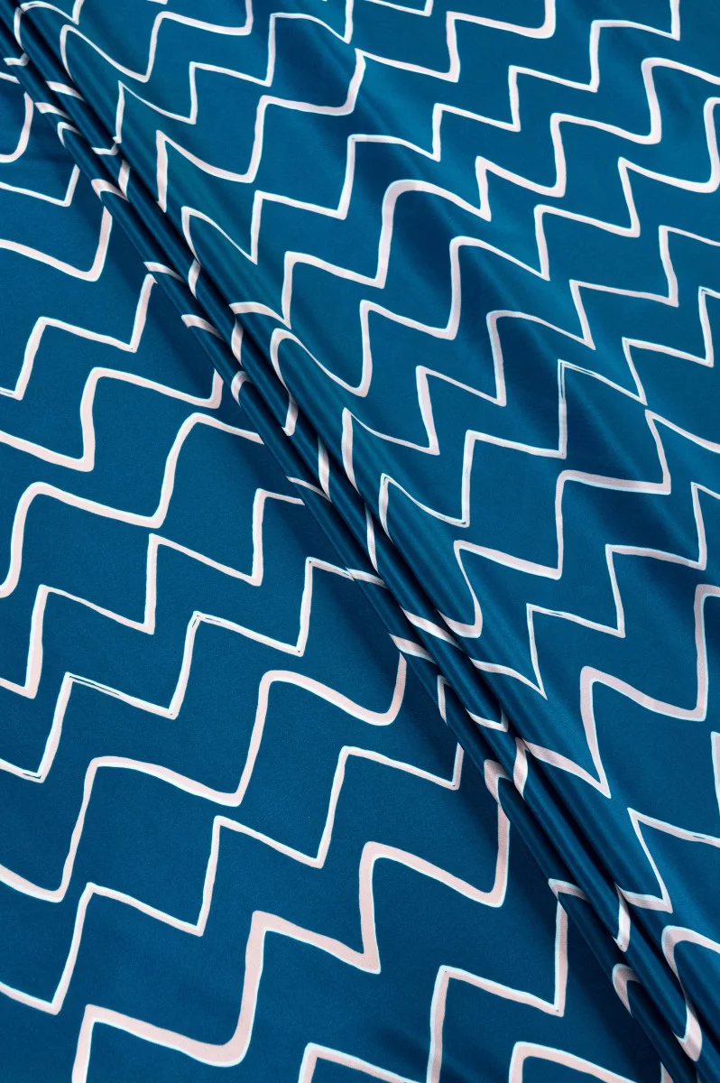 Crep italian de mătase 100% în albastru verzui cu un motiv de zig-zag de somon, dispuse vertical (de-a lungul lungimii țesăturii). Crepul de mătase este o țesătură delicată, subțire, semi-mată. Este moale la atingere și se potrivește foarte bine. Poate fi folosit pentru a evoca rochii aerisite, bluze delicate, fuste, eșarfe, eșarfe.