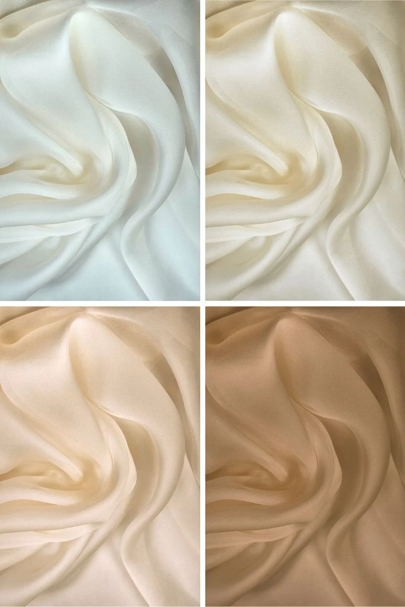 Muselină italiană 100% mătase cu un gramaj mai mare în mai multe culori. Țesătura este foarte ușoară, aerisită, ușor transparentă (nu la fel de mult ca muselina clasică) și inelastică. O țesătură interesantă perfectă pentru rochii, fuste, tunici sau pareo delicate.