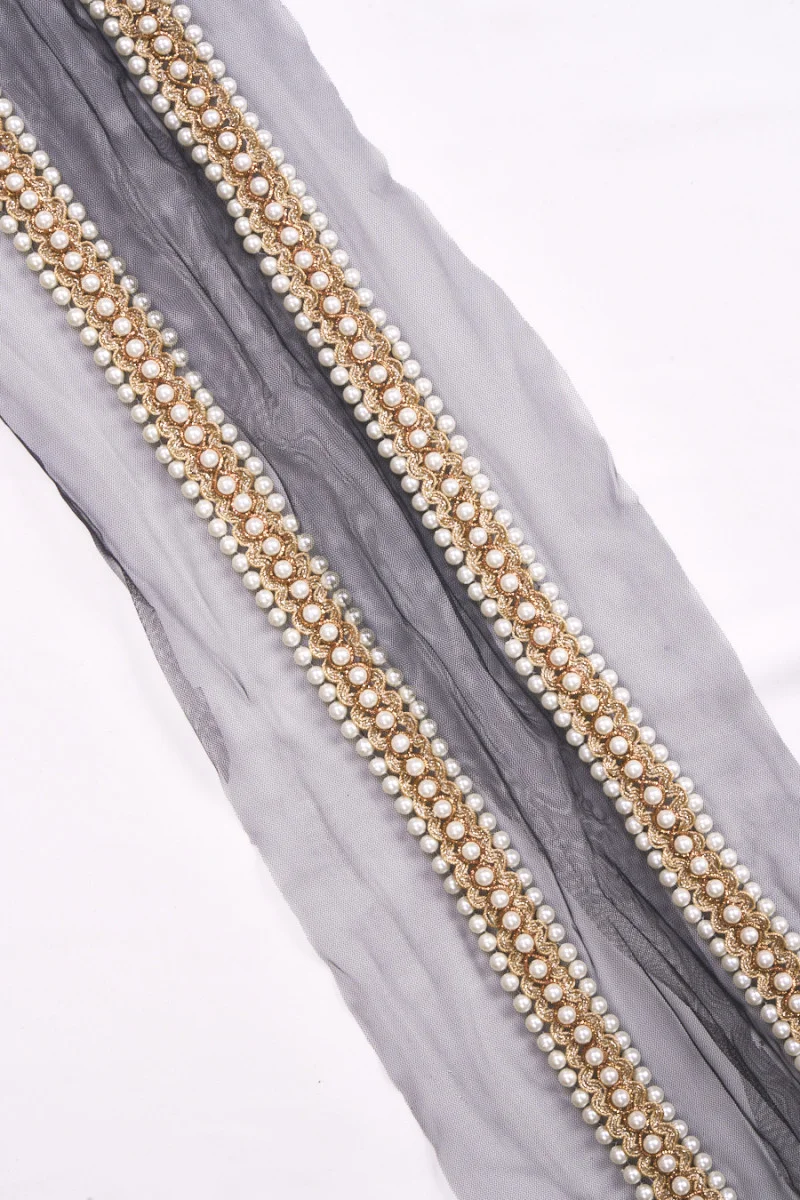 Bandă italiană de mercerie în negru, lățime de 2,7 cm, bogat decorată cu perle. Banda este realizată din perle plasate în trei rânduri, centrul este decorat cu fire de aur care creează valuri. Întregul este cusut pe o plasă de tul negru. O propunere frumoasă pentru a decora o rochie, bluză sau fustă elegantă.