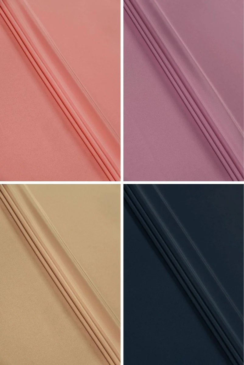 Țesătură de rochie cadi italiană în mai multe culori. Țesătura Cadi este opacă, cărnoasă, curgătoare (grea), inelastică cu o ușoară strălucire.