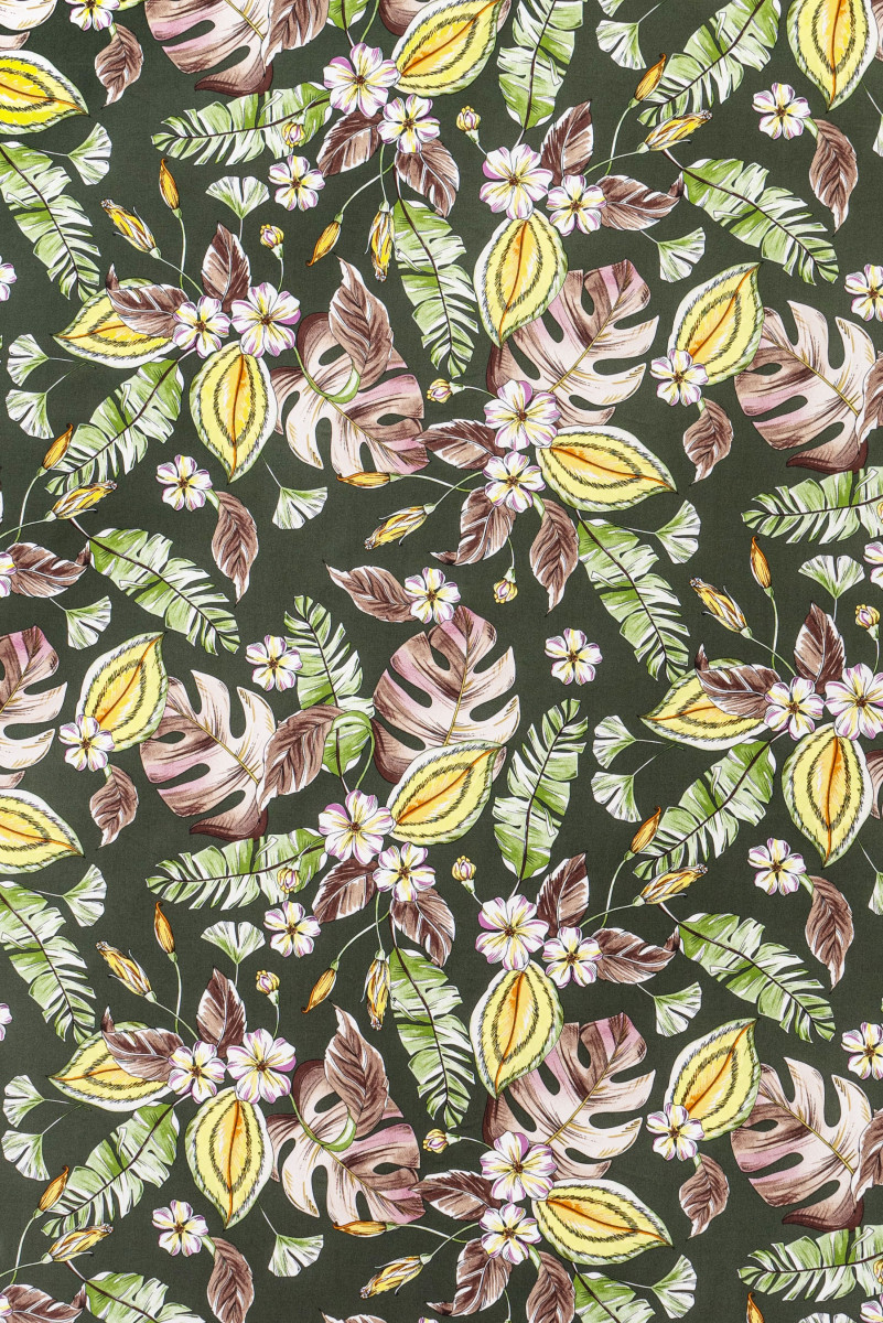 Țesătură italiană de bumbac în kaki cu un motiv de frunze și flori exotice.