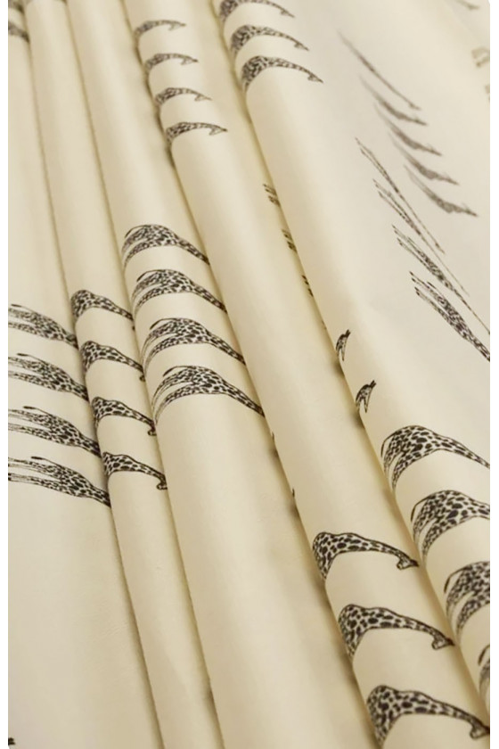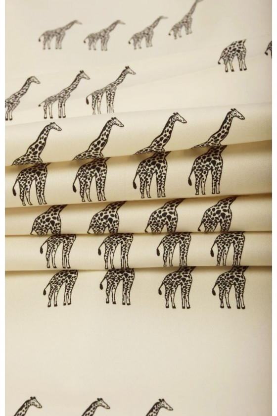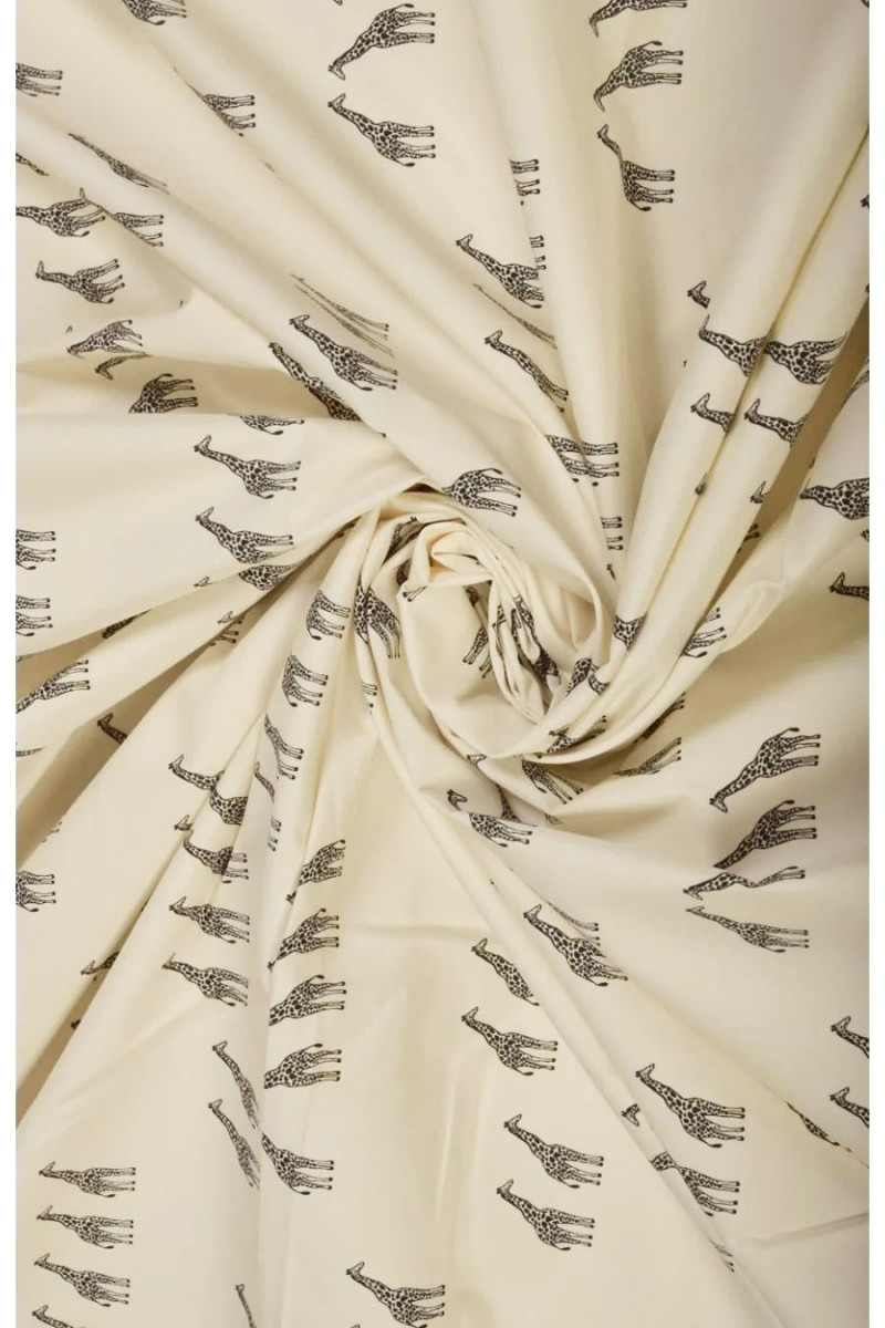 Țesătură italiană din bumbac cu un amestec de elastan în vanilie cu un motiv de girafe negre, cu dimensiunea de 3,5 cm. Țesătură elastică, mai groasă, opacă - perfectă pentru coaserea unei rochii, fustă, pantaloni sau pantaloni scurți.