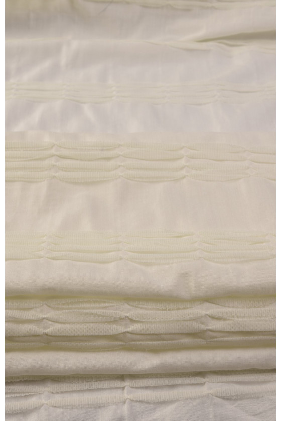 Țesătură italiană 100% bumbac de culoare écru cu panglici de tul cusute care formează dungi orizontale de aproximativ 3 cm lățime, la fiecare 6 cm. Țesătură subțire, ușor transparentă, neelastică - perfectă pentru coaserea unei bluze, rochii sau fuste de vară.