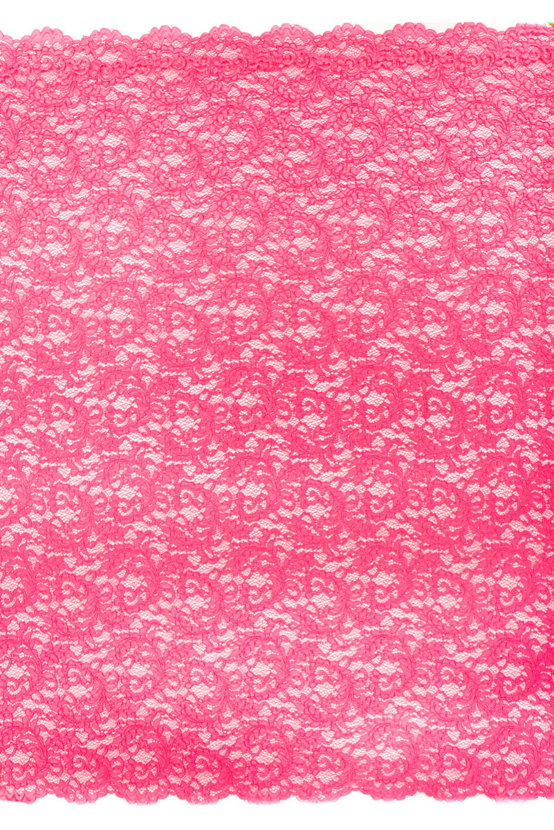 Dantelă italiană în roz fierbinte - roz. Țesătura are un motiv floral dens legat cu plasă și terminat cu un cordon. Coroana este finisată cu un dinte decorativ pe ambele părți - îl coasem circumferențial. O propunere foarte frumoasă pentru persoanele cărora le plac culorile puternice, de vară.