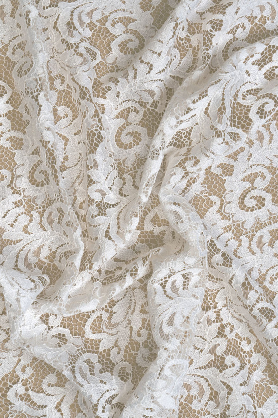 Dantelă italiană de culoare crem. Țesătura are un motiv floral dens conectat cu plasă și finisat cu un șnur. Coroana este finisată cu un dinte decorativ pe ambele părți - o coasem circumferențial. O propunere foarte frumoasă pentru persoanele cărora le plac culorile strălucitoare, dar nu albe.