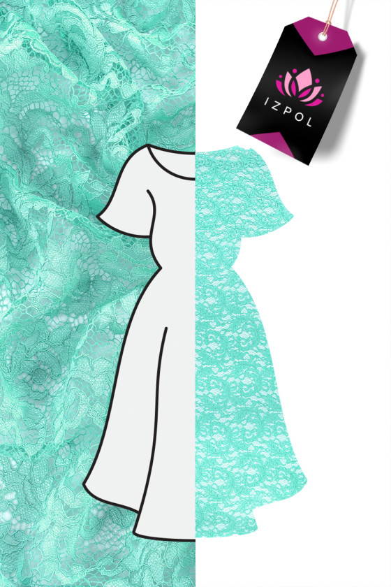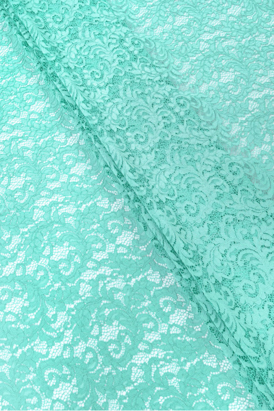 Dantelă italiană în turcoaz cu un motiv floral dens. Țesătura este moale, neelastică, finisată pe ambele părți cu un dinte decorativ.