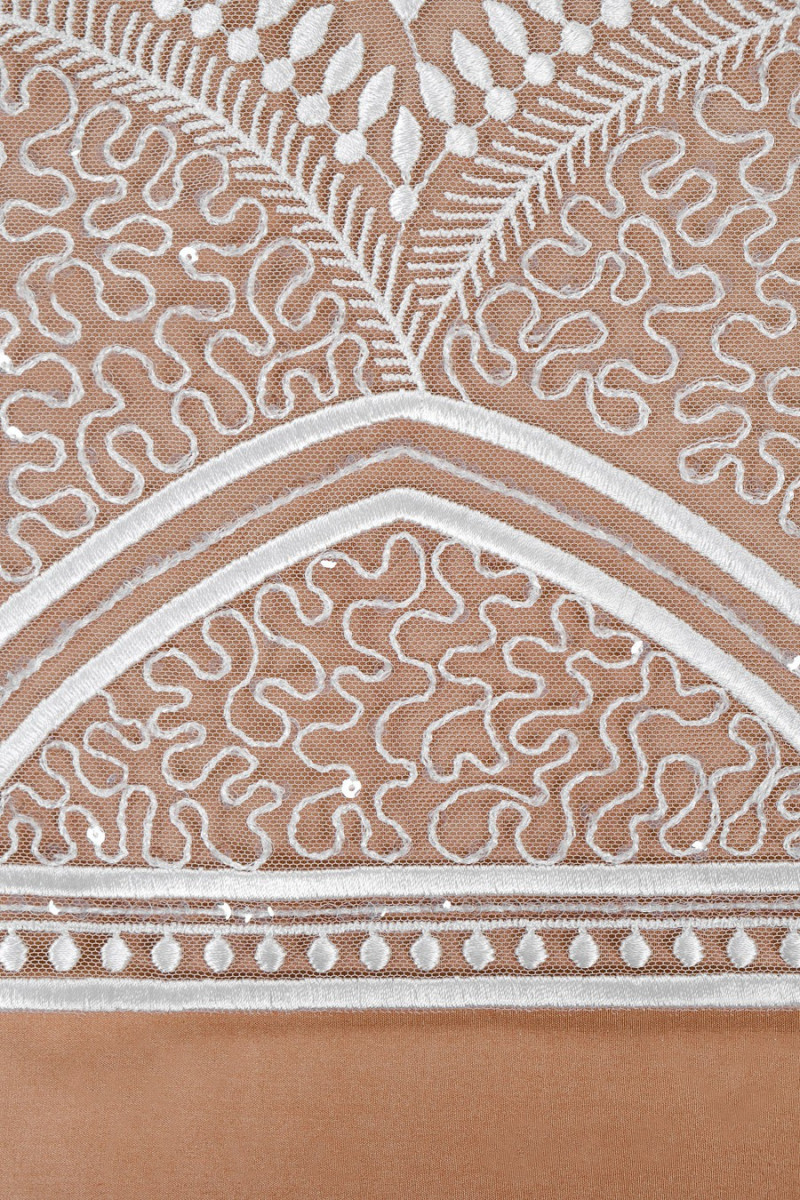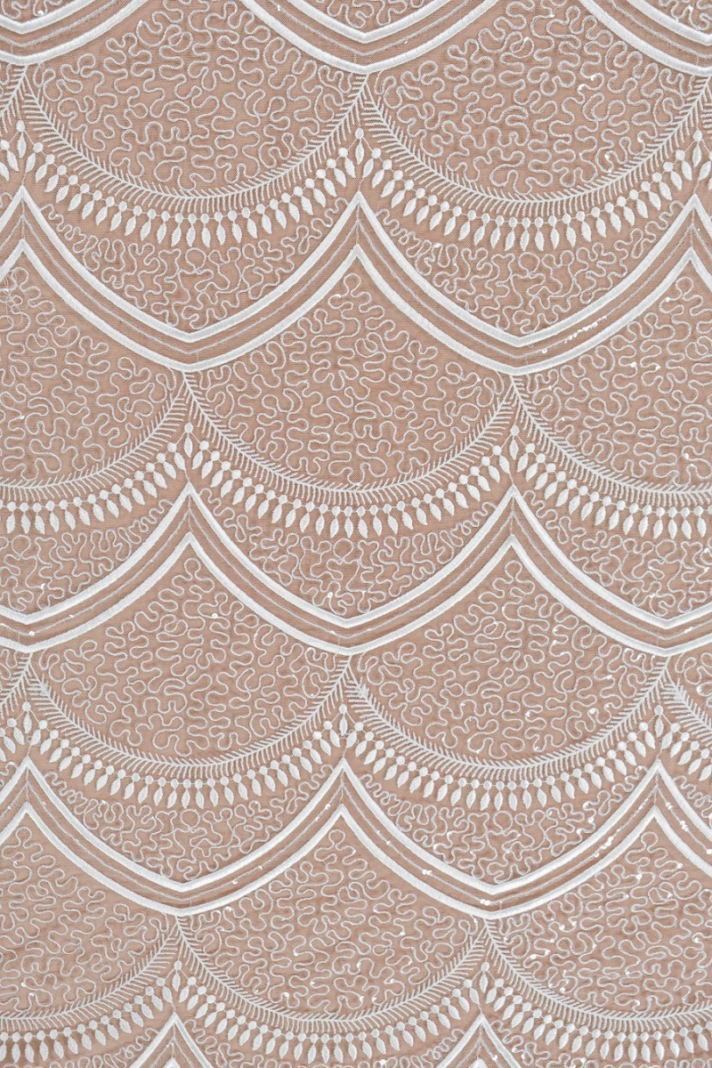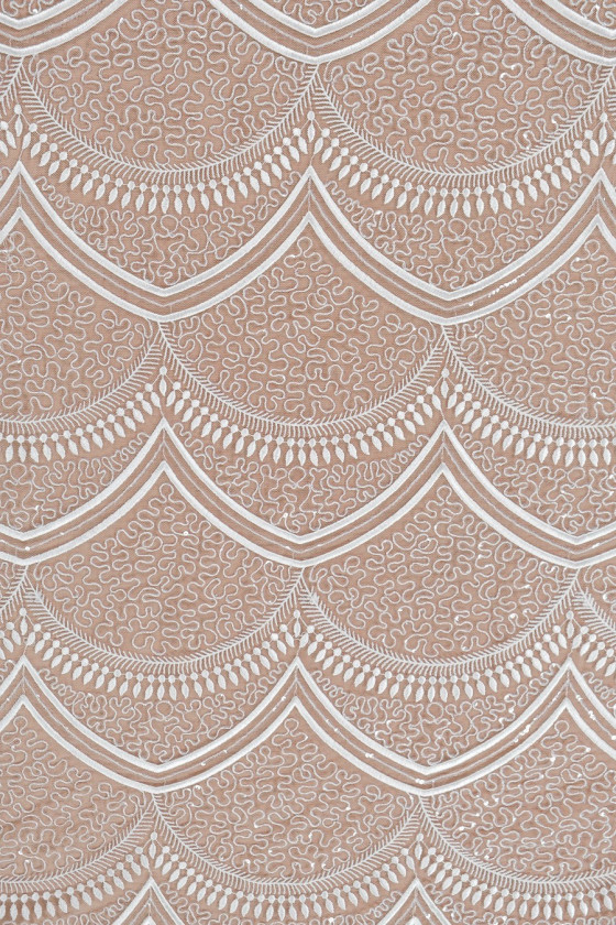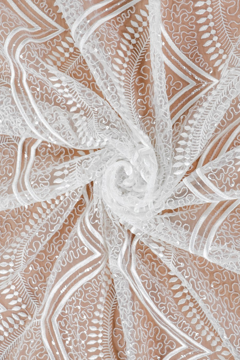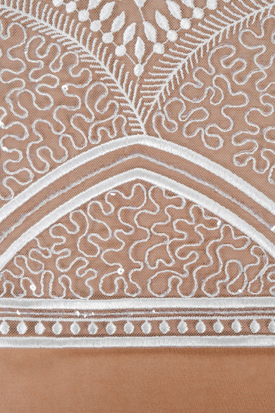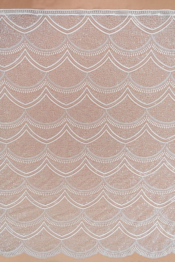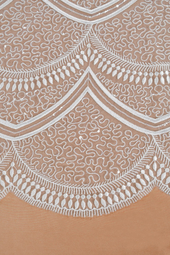 O coroană frumoasă, albă, cu un finisaj dentar pe o parte. Dintele are o lățime de aproximativ 20 cm. Brodat cu margele si paiete. Materialul este perfect pentru rochii de mireasă și bluze.