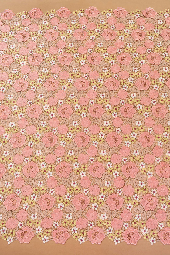Dantelă de guipură frumoasă, groasă, cu flori pastelate (roz și galben). Perfect pentru rochii sau fuste elegante de vară.
