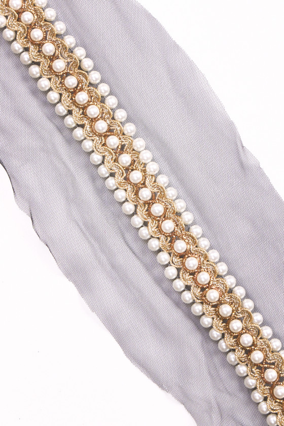 Bandă italiană de mercerie în negru, lățime de 2,7 cm, bogat decorată cu perle. Banda este realizată din perle plasate în trei rânduri, centrul este decorat cu fire de aur care creează valuri. Întregul este cusut pe o plasă de tul negru. O propunere frumoasă pentru a decora o rochie, bluză sau fustă elegantă.