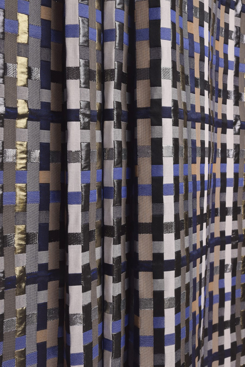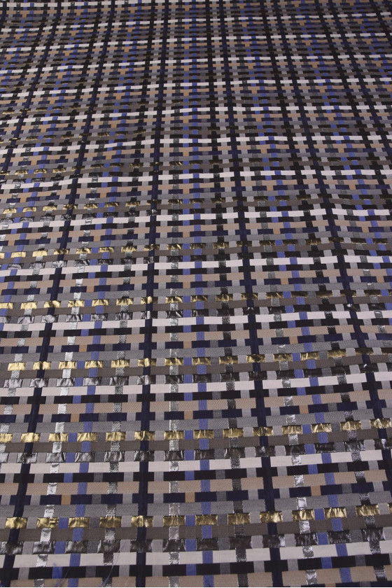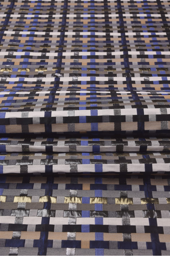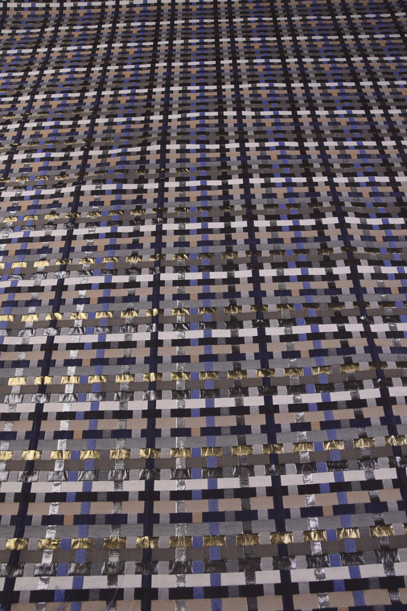 Țesătură costum jacquard italiană - multicoloră. Modelul de aici este alcătuit din benzi împletite de 1 cm lățime în diferite culori, min. bleumarin, gri, bej, albastru și auriu. Țesătura este subțire, inelastică, dar rigidă, își păstrează frumos forma, seamănă cu tafta. Este perfect pentru a coase o fustă largă, o rochie sau o haină subțire, decorativă.