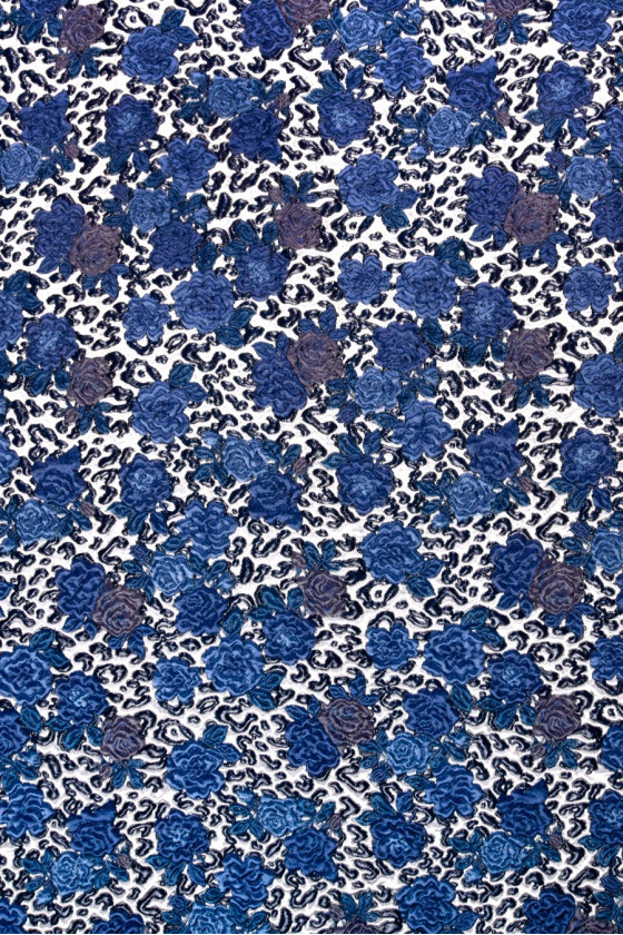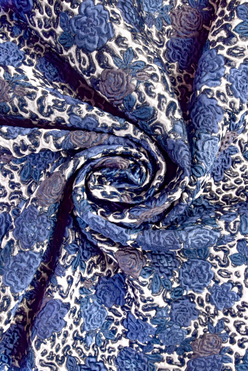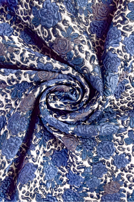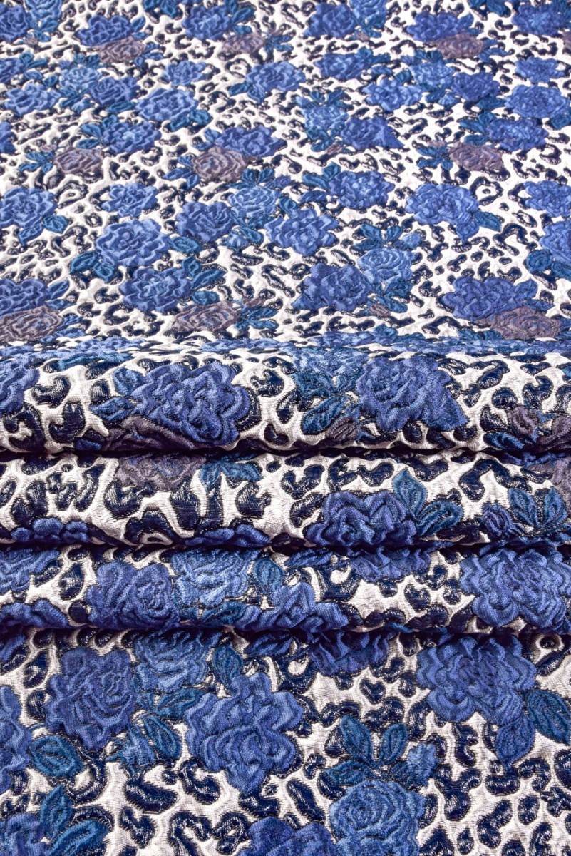 Țesătură de costum jacquard italian într-un cupon cu dimensiunile de 65cm x 140cm. Un model foarte izbitor, convex de flori de trandafir în albastru și bleumarin. Întregul este realizat pe un fundal gri deschis și este decorat cu un fir strălucitor, care conferă țesătură eleganță. Cuponul vă permite să coaseți o fustă îngustă sau, de exemplu, o pernă. Este, de asemenea, ideal ca bază pentru combinarea cu alte țesături.