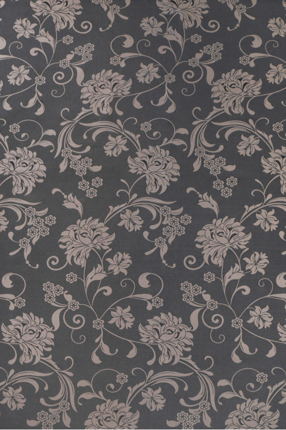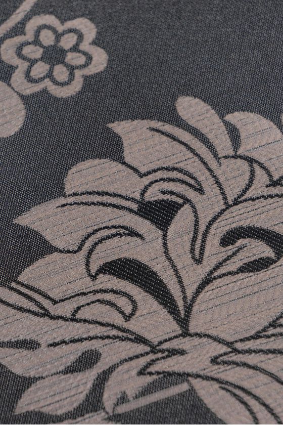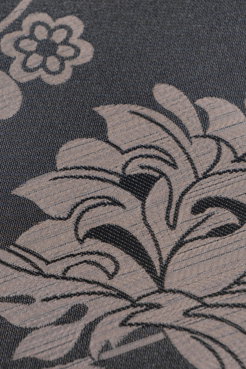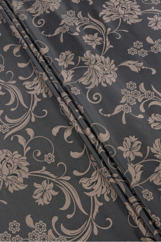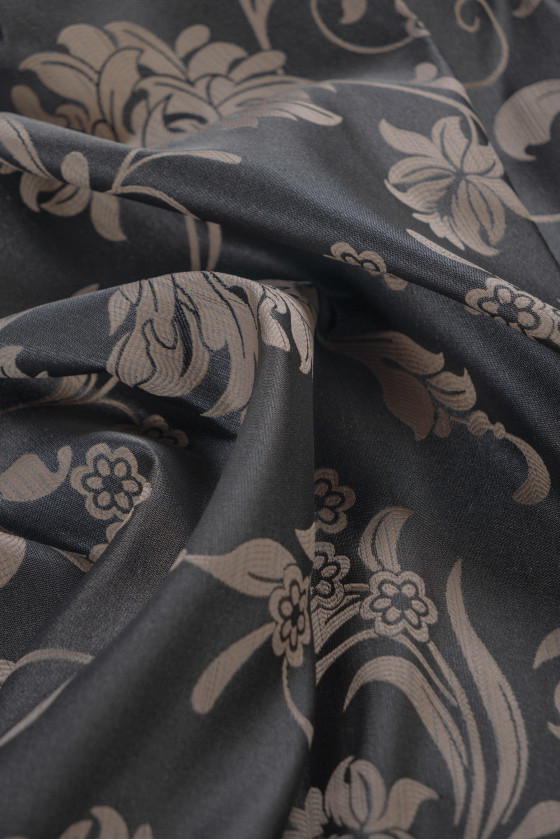 Țesătură de costum italian jacquard în gri, cu un motiv floral bej. Țesătura este mai groasă, rigidă, inelastică, strălucitoare nobil pe o parte și mată pe cealaltă - poate fi cusută pe ambele părți (culori inverse).