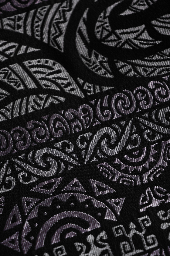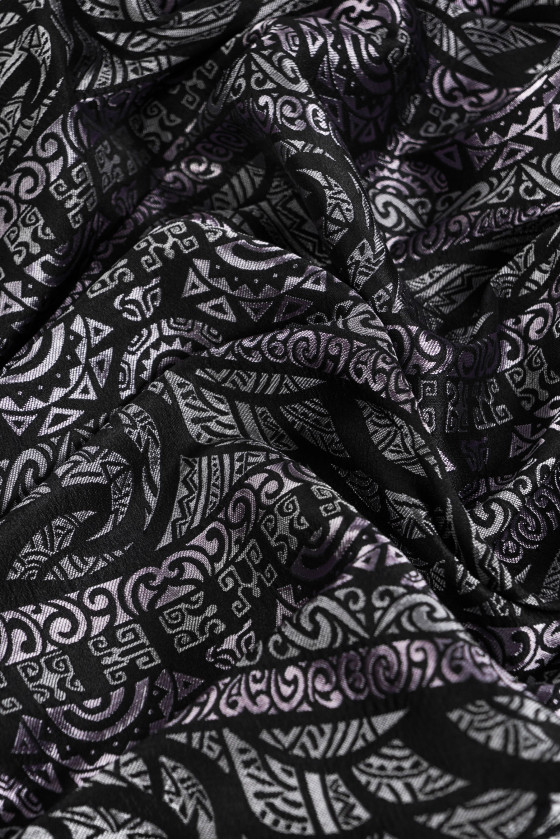 Țesătură de costum jacquard italian cu motive orientale care formează dungi orizontale de 12 cm lățime. O combinație frumoasă de negru, gri și violet murdar. Fundalul țesăturii este mat, iar modelul este ușor strălucitor. Țesătura este mai groasă, rigidă, neelastică, cu o strălucire caracteristică. Perfect pentru coaserea unei rochii, costum, fuste sau în scopuri decorative.
