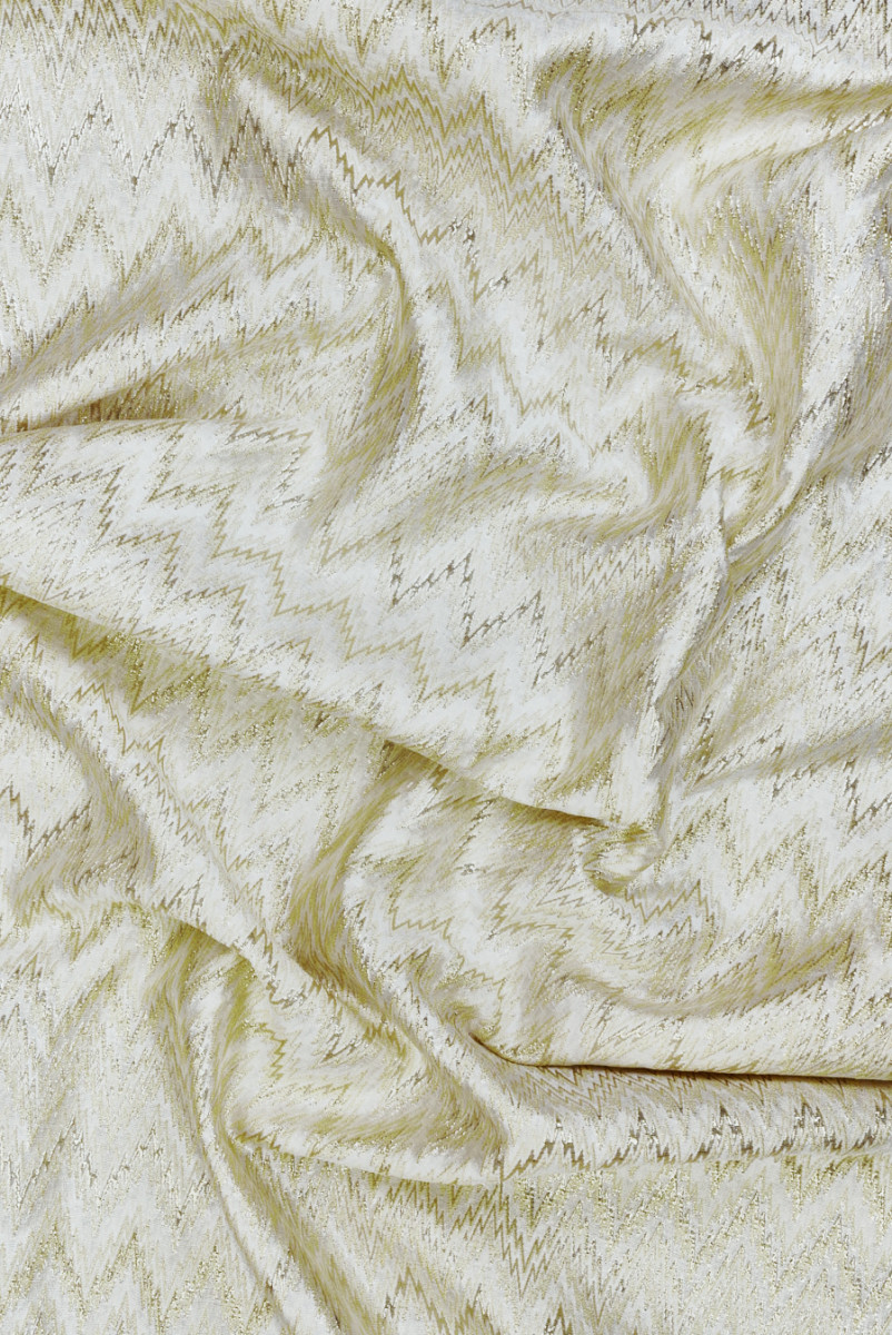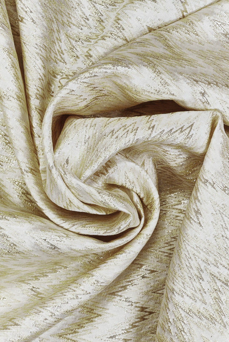 Țesătură jacquard italiană cu un motiv în zig-zag bej și auriu. Model regulat, dens, frumos decorat cu fir de aur. Țesătura este de grosime medie, ușor rigidă, neelastică și opacă. O propunere impresionantă și proaspătă din care puteți crea costume, fuste, jachete sau paltoane de primăvară.