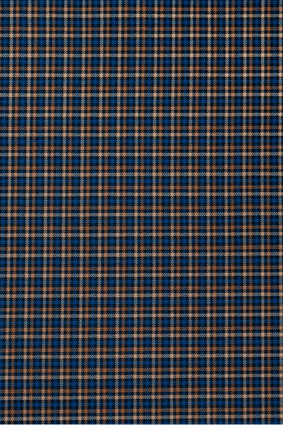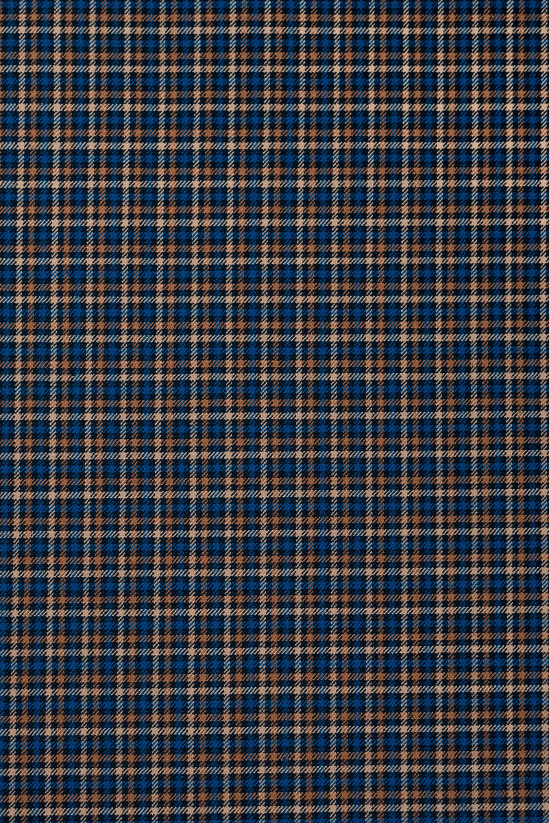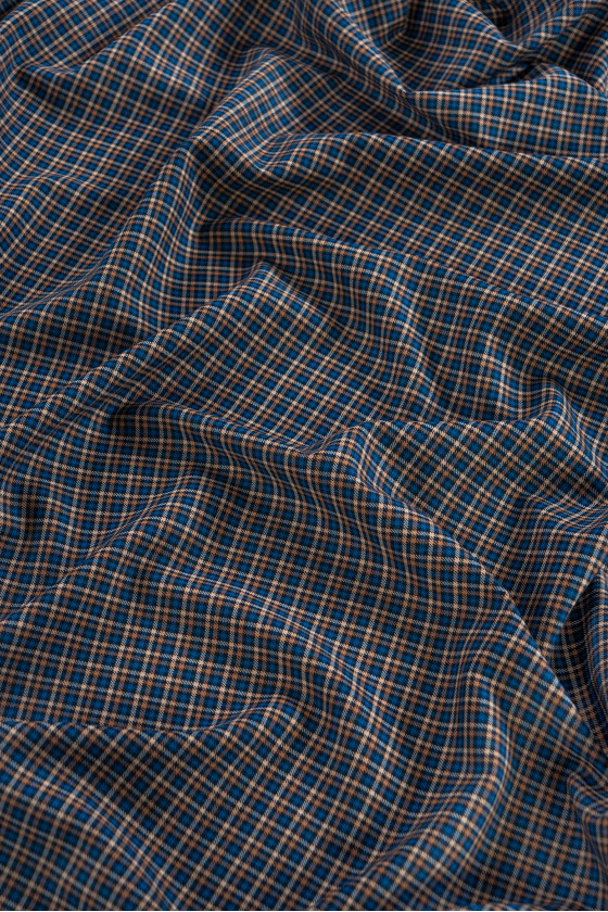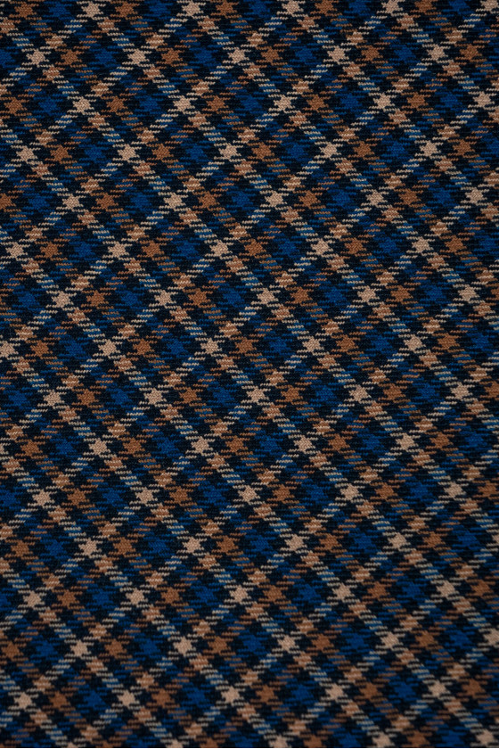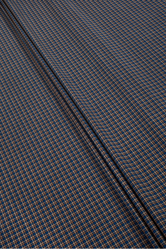 Lână de costum italiană cu carouri fine (0,5 cm) în negru, bej și albastru de mare. Țesătură elastică, de grosime medie - perfectă pentru coaserea unui costum, pantaloni, fustă, rochie sau costum.