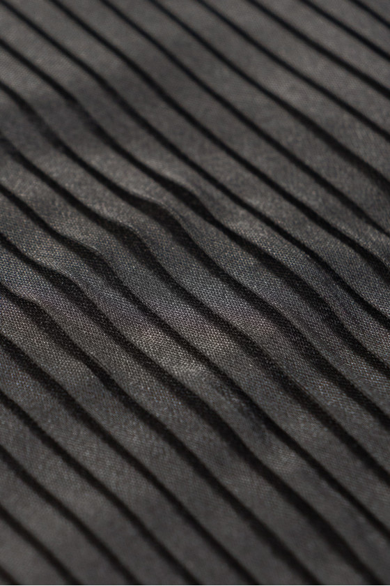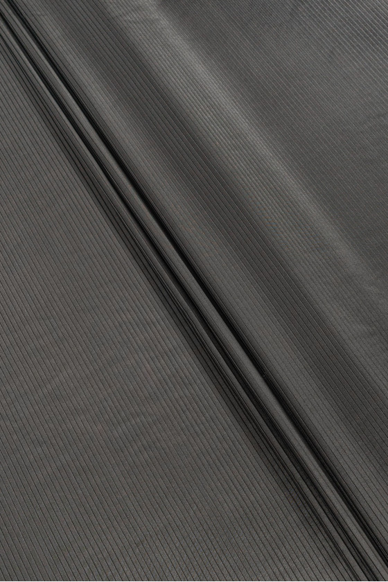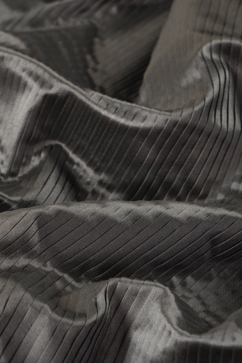 Țesătură italiană 100% mătase, plisată în gri. Țesătura este lipită cu o interlinie subțire. Țesătura este mai subțire, ușor rigidă, plisată în jurul circumferinței cu un luciu caracteristic țesăturilor de mătase.