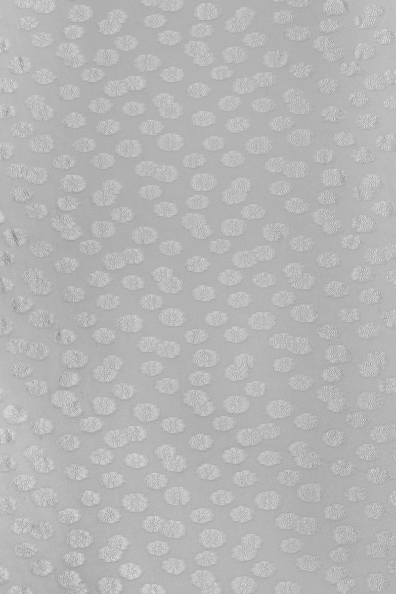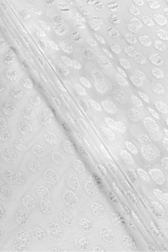 Țesătură italiană de organza din mătase-poliester cu flori crem cusute.