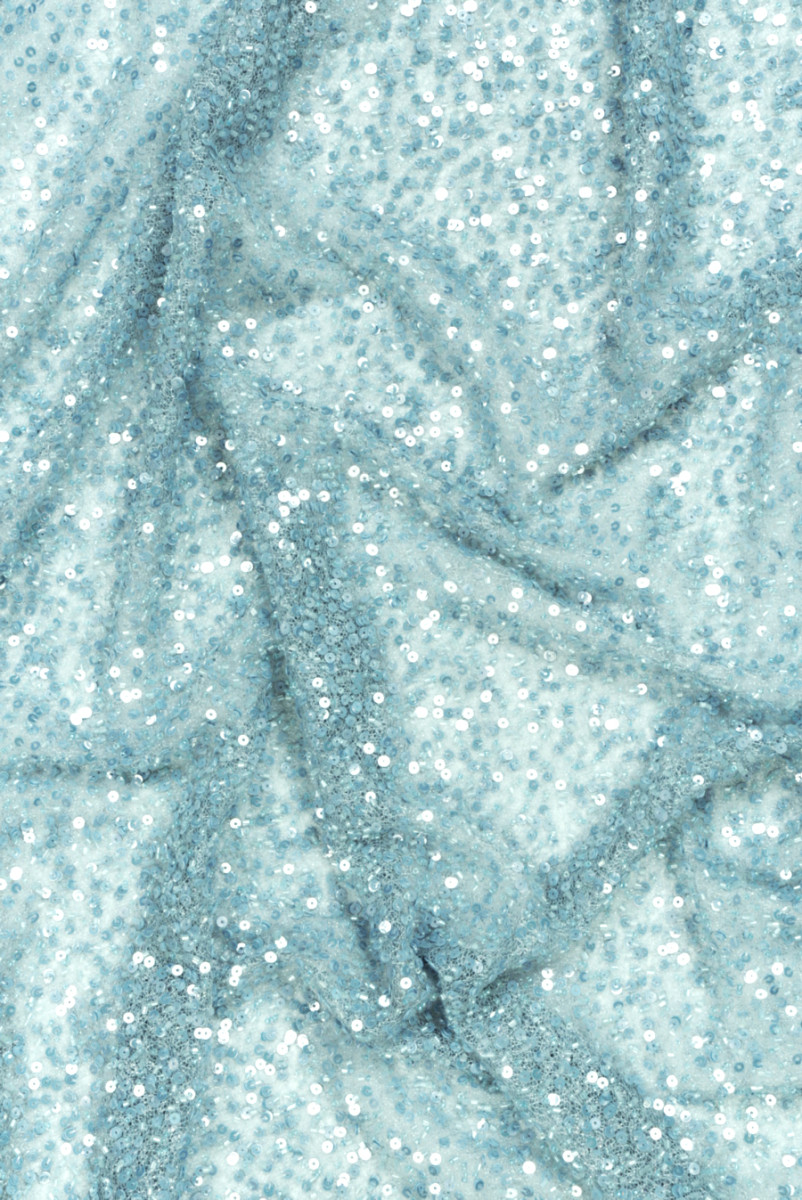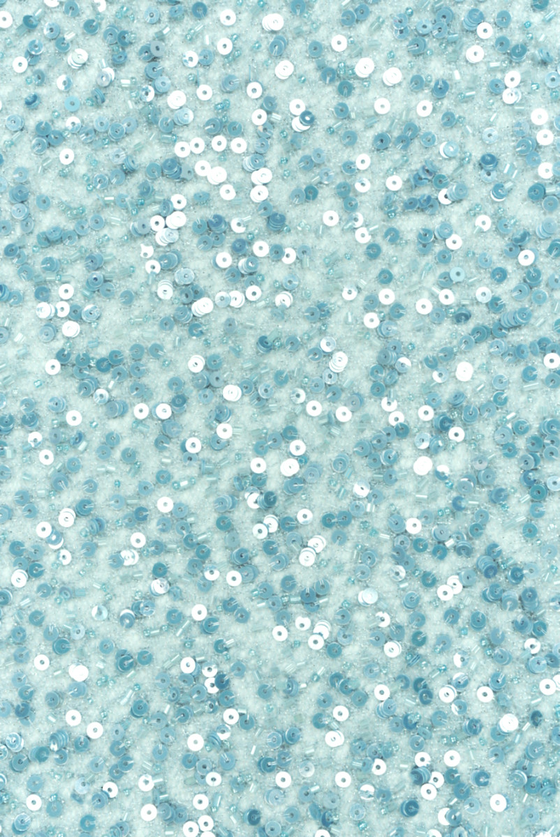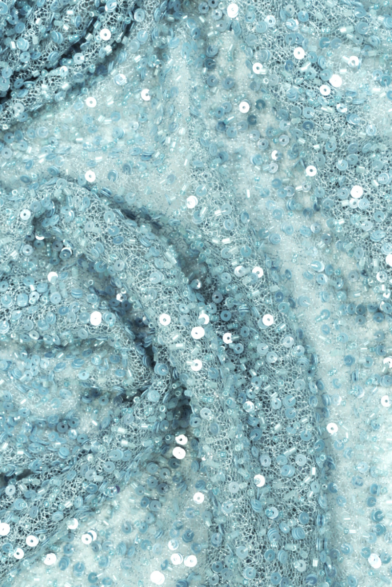 Țesătură italiană sub formă de plasă cu ochiuri neregulate în albastru, bogat decorată cu margele și paiete în aceeași culoare. Țesătura este transparentă (necesită căptușeală), destul de grea, ușor elastică, iar margelele și paietele strălucesc frumos. O propunere fantastică și foarte eficientă pentru coaserea unei rochii de seară, fustă sau bluză.
