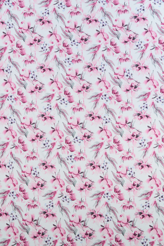 Țesătură italiană din poliester cadi cu un motiv de flori roz pe fundal alb. Modelul dens este ușor neclar, completat de culori gri, datorită cărora câștigă un aspect unic. Țesătura este carne, care curge, cu o țesătură netedă, strânsă, ușor elastică. Va fi perfect pentru coaserea unei fuste, a unei rochii și a unui costum. O propunere fantastică pentru persoanele cărora le place designul floral.