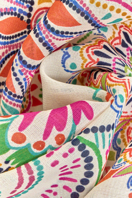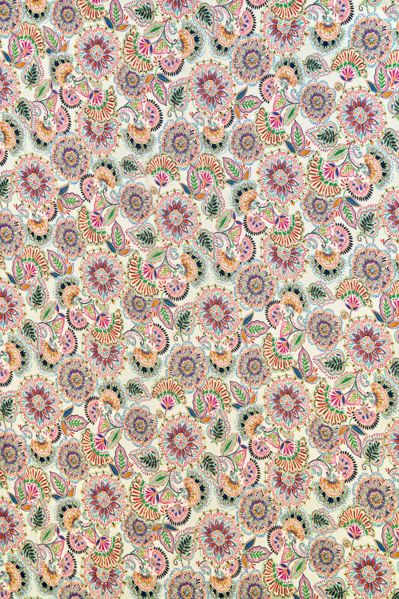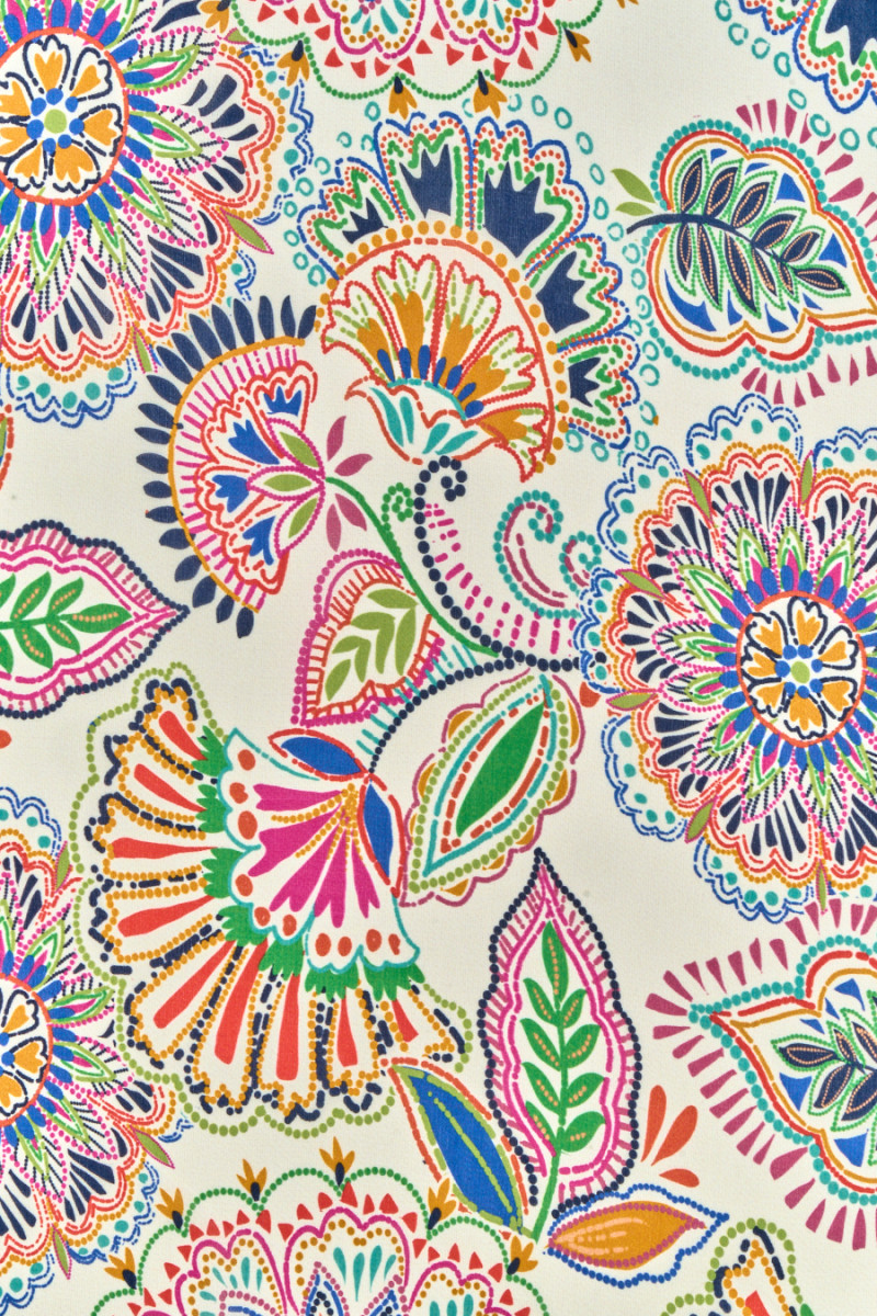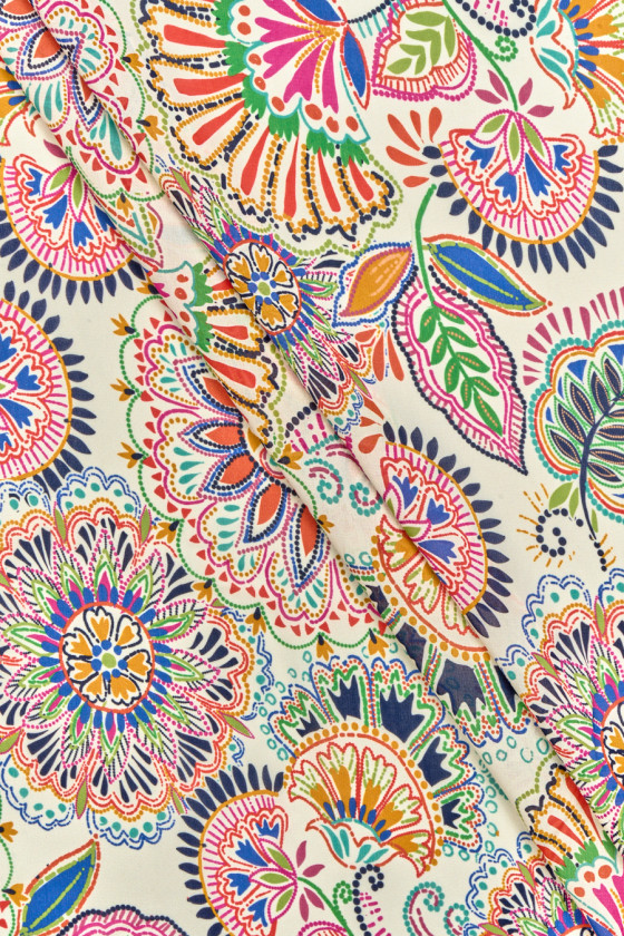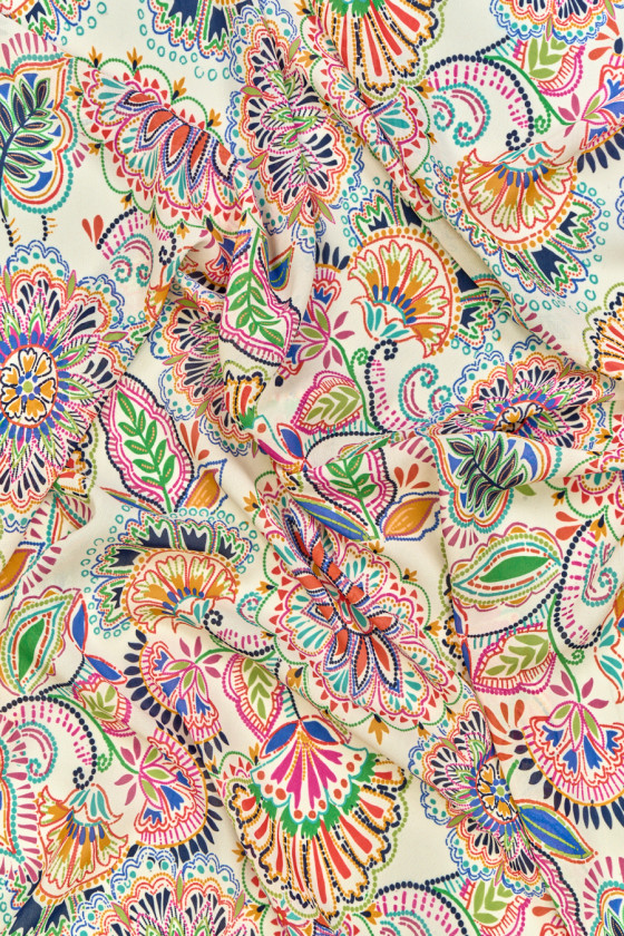 Țesătură italiană 100% viscoză cu un motiv de flori folclorice pe fundal crem. Modelul este dens, colorat, de dimensiuni medii. Țesătura este subțire, ușor transparentă, mată, curgătoare și ușoară, precum și rece și ușor dură la atingere. O propunere excelentă pentru rochii, fuste și bluze aerisite.