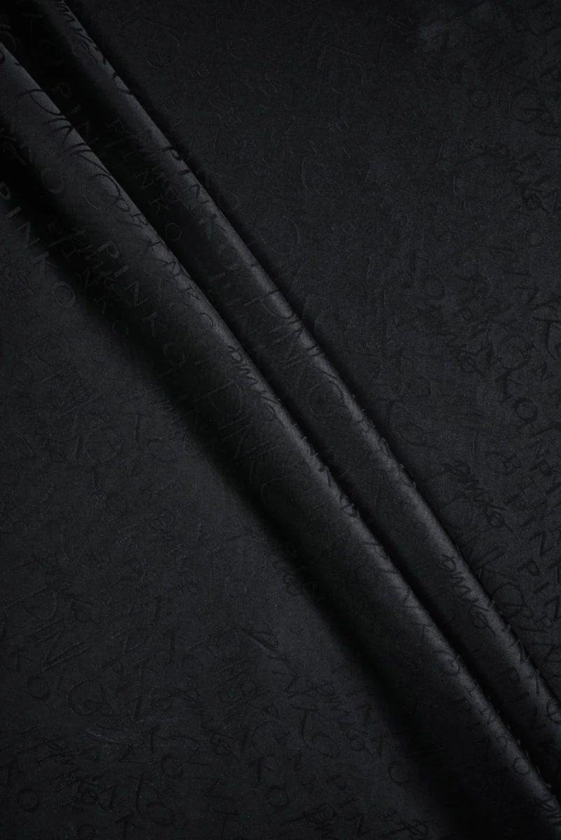 Țesătura jacquard italiană țesută dintr-un amestec de vâscoză, acetat și poliamidă, cu un motiv de litere negre. Modelul mat este dens și realizat în diverse dimensiuni și fonturi, în timp ce fundalul negru este strălucitor. Materialul este de grosime medie, opac, neelastic și are o țesătură strânsă. Este puțin grea, adică curge în jos. Provine din colecția unui brand de modă cunoscut. Poate fi folosită pentru a coase o bluză, o cămașă, o fustă sau ca căptușeală.