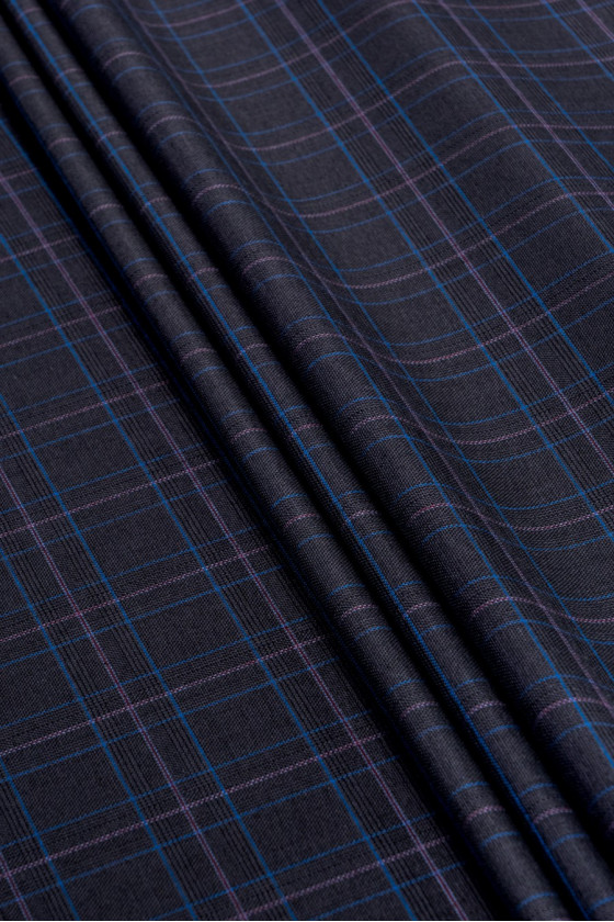 Țesătură de costum italian de înaltă calitate. Cel mai la modă motiv în carouri în următoarele culori: grafit, albastru, visiniu.
